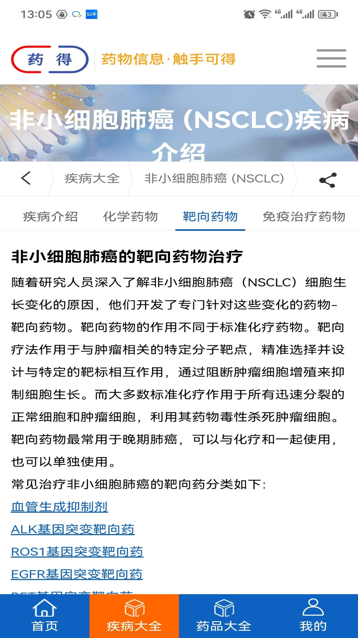 疾病页,包括疾病介绍、化学药物、靶向药物、免疫治疗药物介绍。
