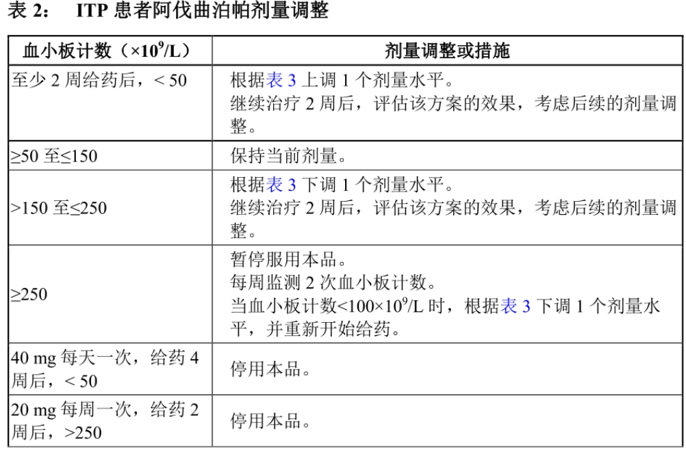 开始使用本品治疗后,每周评估血小板计数,直到患者达到稳定的血小板计数≥50×109/L 达到后,每月监测血小板计数。